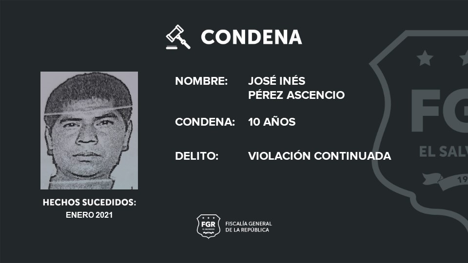 Ahuachapán. José Inés Pérez Ascencio fue sentenciado a cárcel por violación continuada de una menor de edad. Los hechos ocurrieron en el distrito de Apaneca, Ahuachapán.