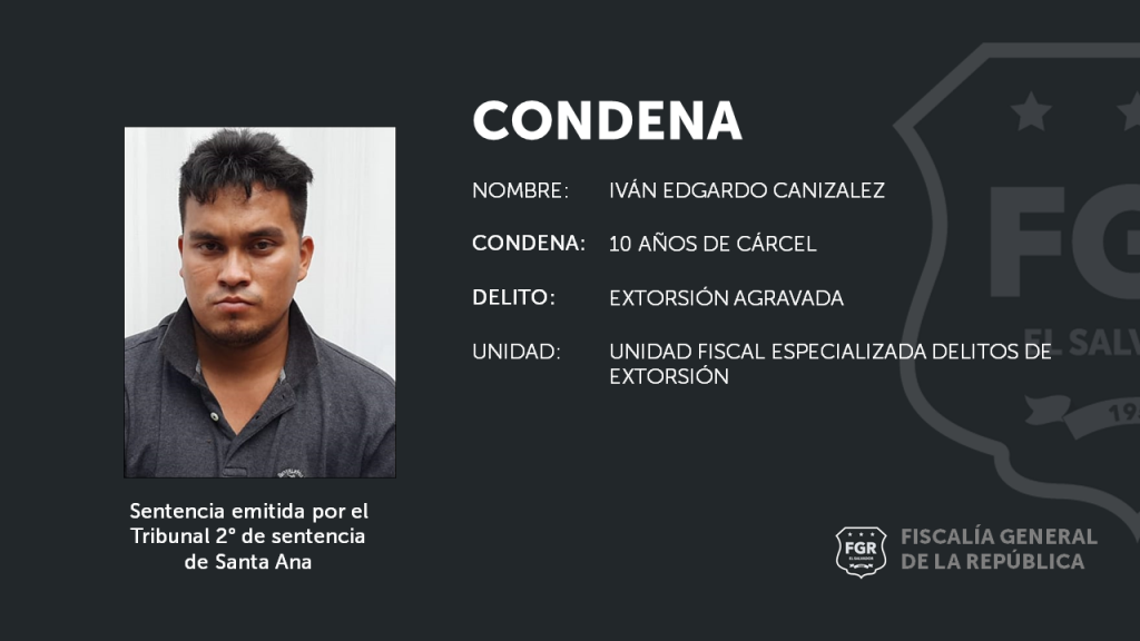 Santa Ana. La Fiscalía, a través de la Unidad Especializada de Delitos de Extorsión logró que un Tribunal impusiera a Iván Edgardo Canizalez Marroquí una condena de 10 años de prisión por el delito de Extorsión Agravada, ocurrido en junio del 2020 en el municipio de Santa Ana.