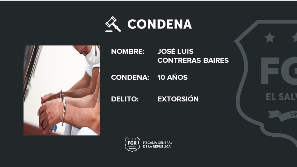 La Fiscalía General de la República realizó las investigaciones necesarias para recolectar las pruebas suficientes y en la vista pública -juicio-, el Tribunal Primero de Sentencia de Sonsonate se demostró que José Baires cometió el delito de Extorsión y le fue impuesta una pena de 10 años de cárcel.