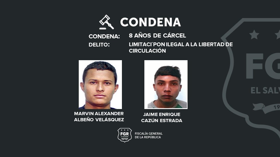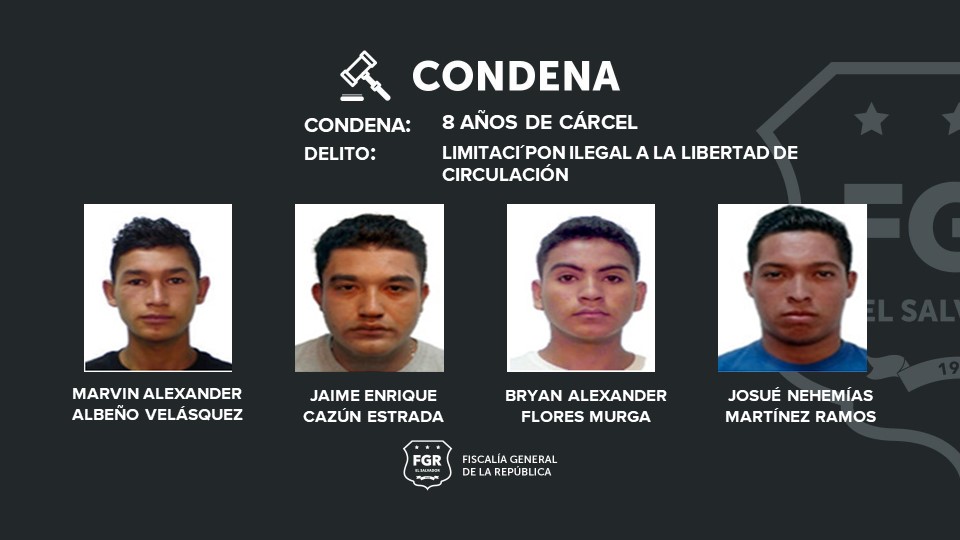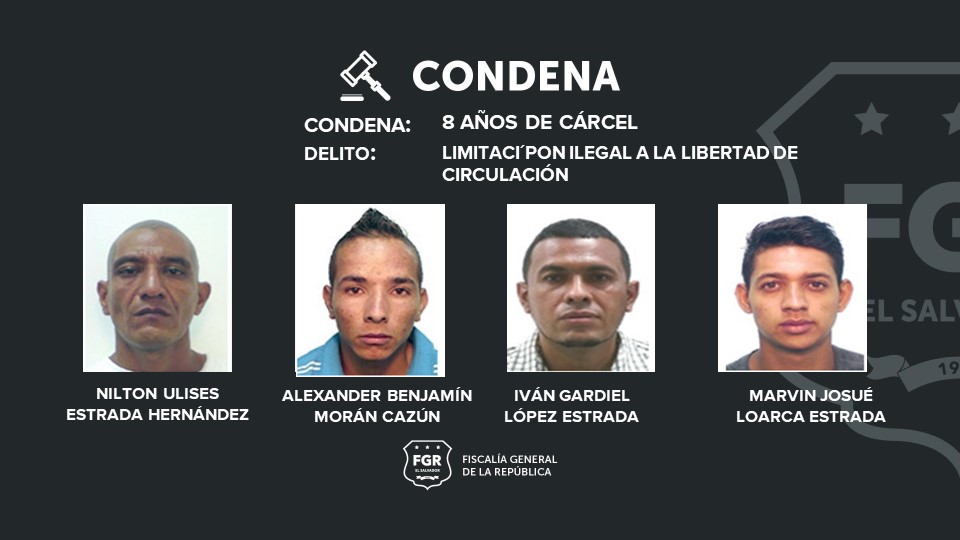 Los imputados sentenciados a cárcel son: Alexander Benjamín Morán Cazún, alias «chande»; Bryan Alexander Flores Murga, alias «el negro»; Fredy Antonio Estrada González, alias «cabra»; Fredy Otoniel Estrada Castro, alias «Otto»; Jaime Enrique Cazún Estrada, alias «la chiva»; Josué Nehemías Martínez Ramos, alias» el sid»; Marvín Alexander Albeño Velásquez, alias «Gasparín»; Nilton Ulises Estrada Hernández, alias «el diablo»; Iván Gardiel López Estrada, alias «tainy»; Jairo Arnoldo Estrada Castro, alias «conejo», y Marvin Josué Loarca Estrada, alias «la vergona».
