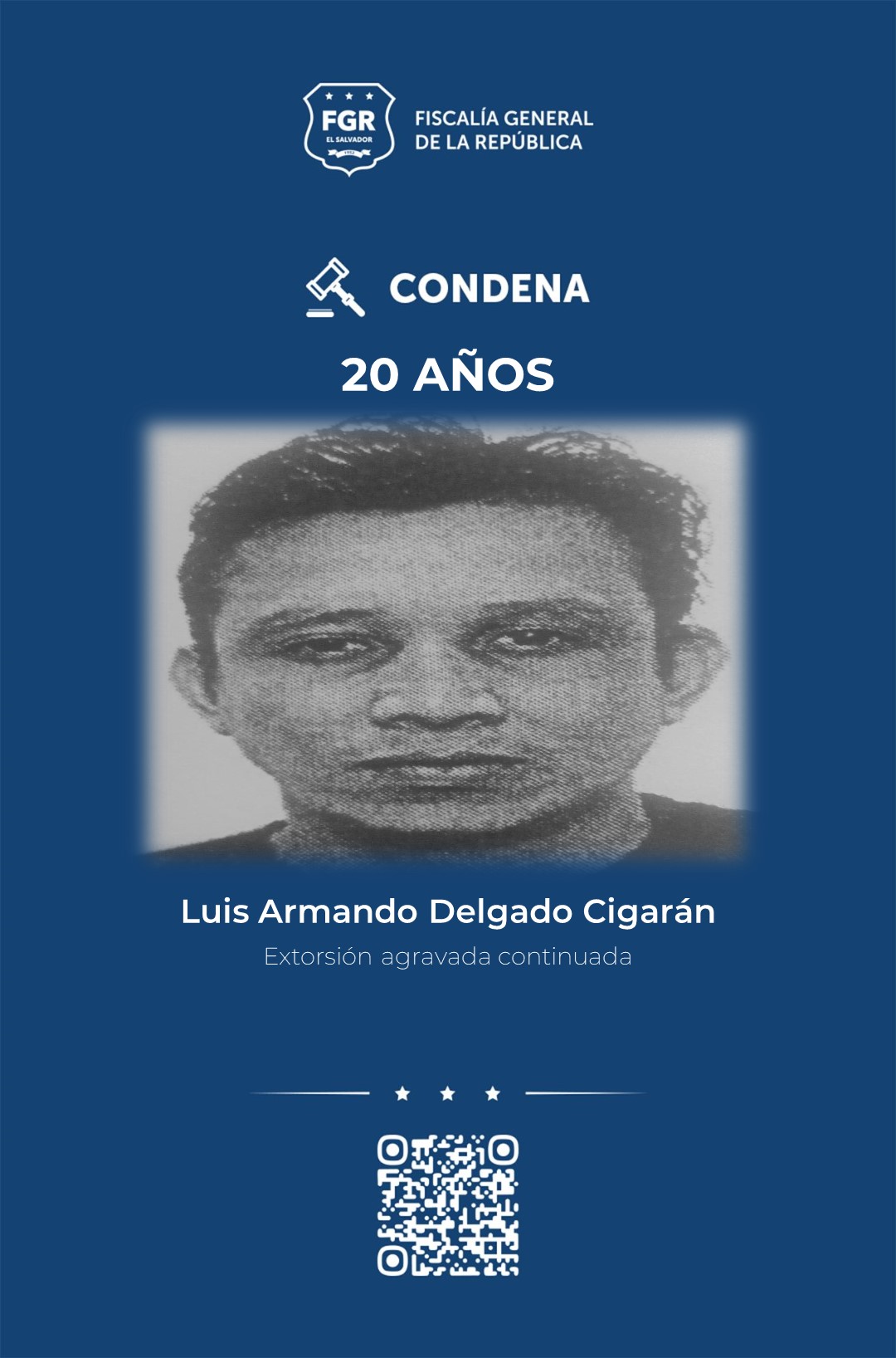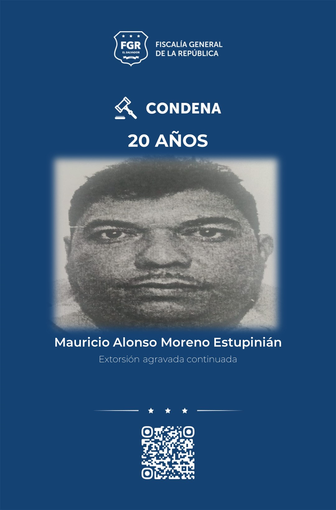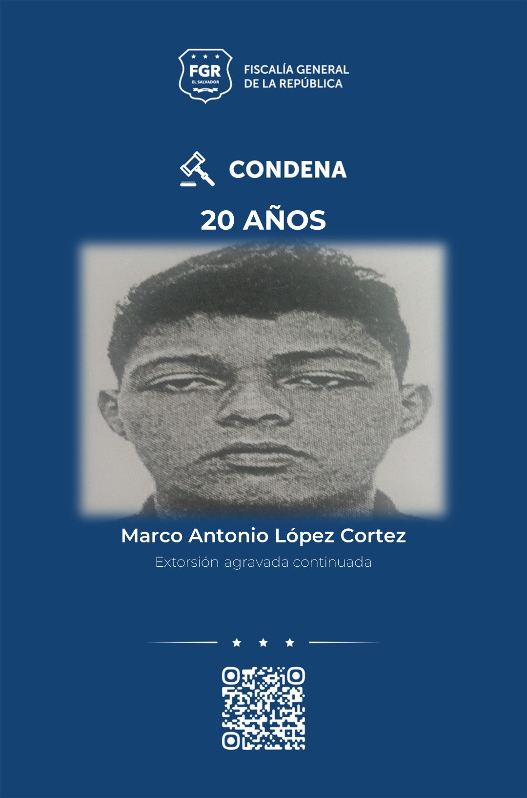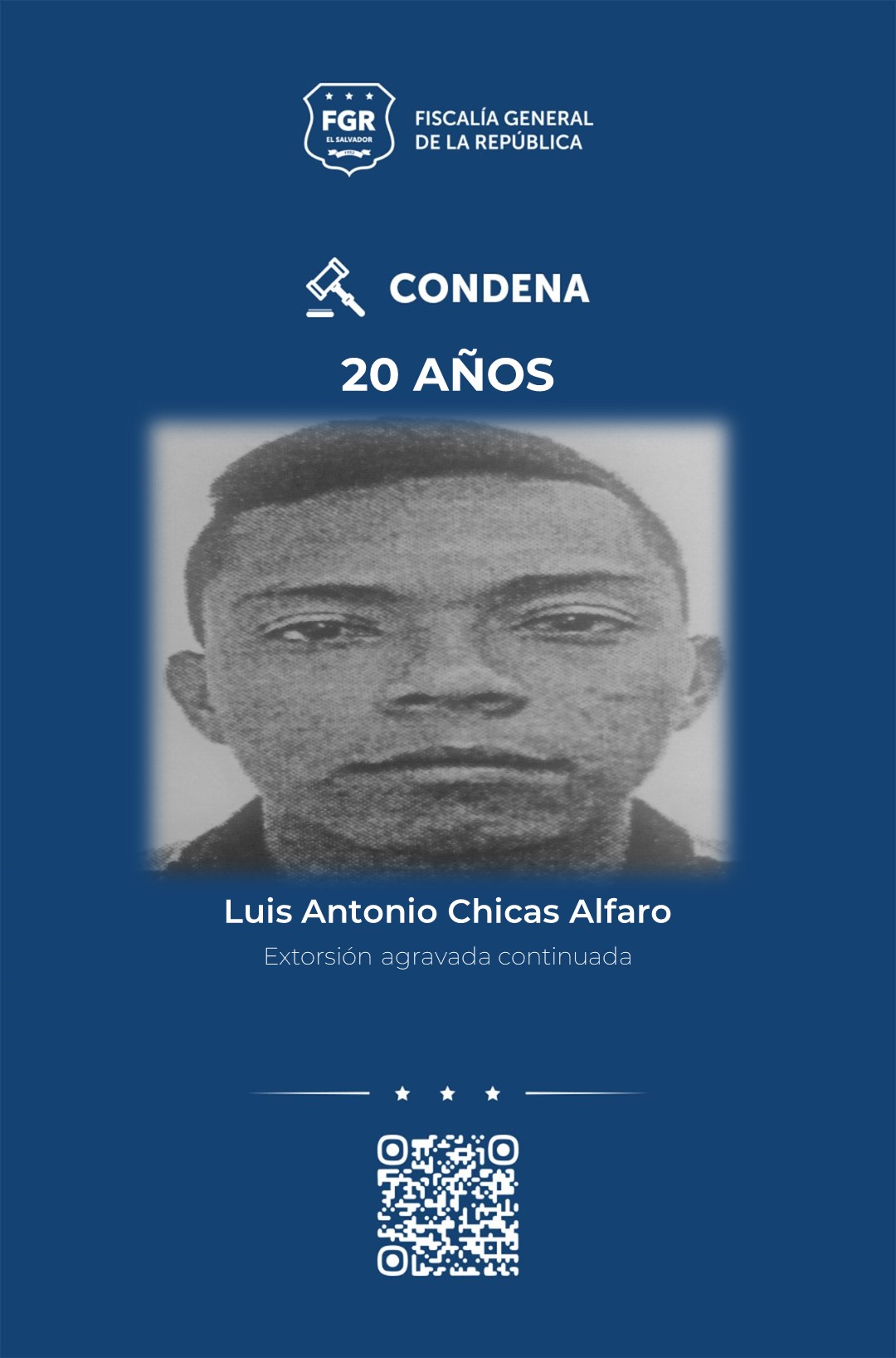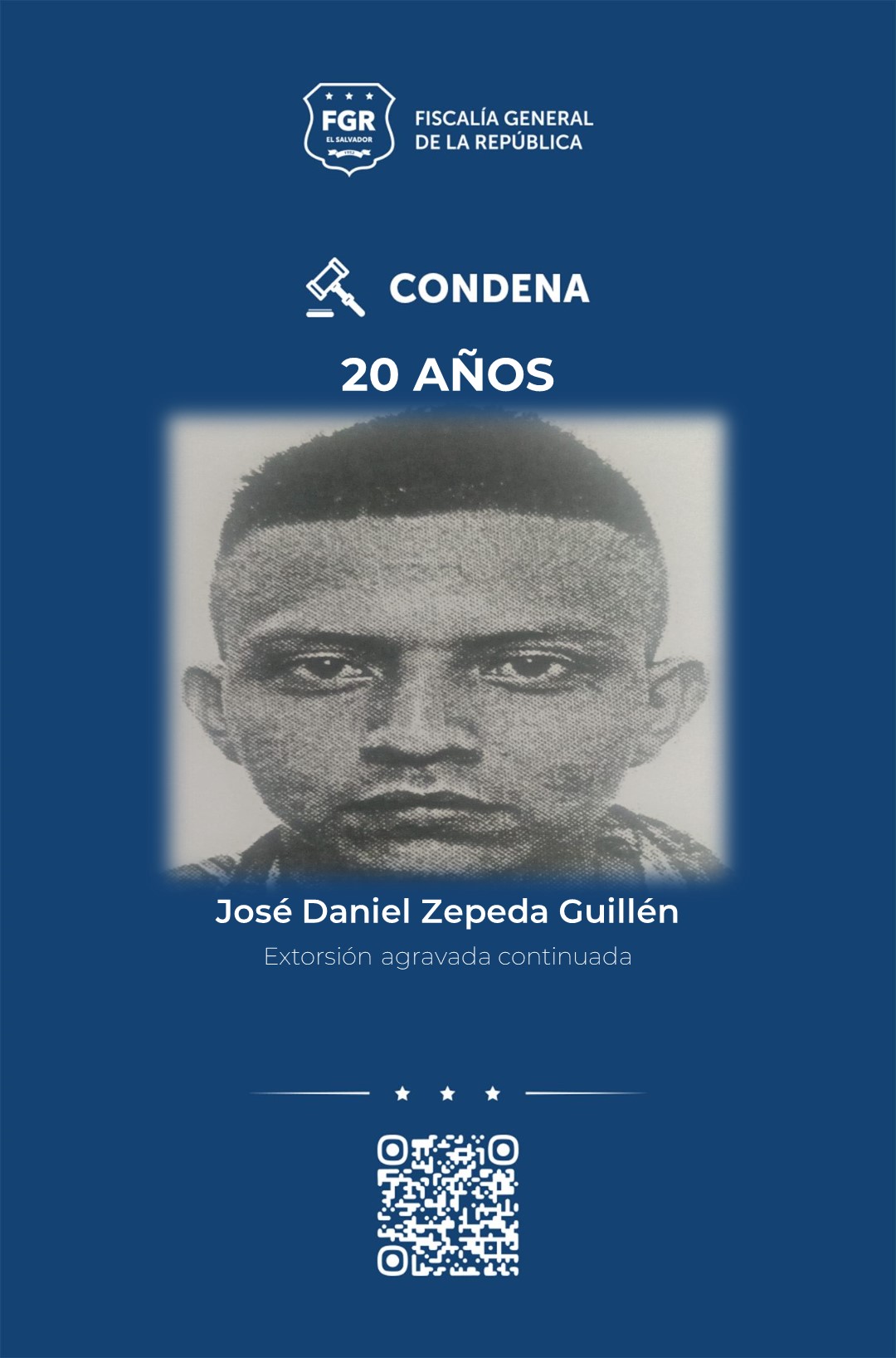 Por el mismo delito de extorsión continuada también fueron condenados a 20 años de prisión: los hermanos, Juan Ramón y José Daniel, ambos de apellido Zepeda Guillén; Luis Antonio Chicas Alfaro, Luis Armando Delgado Cigarán, Mauricio Alonso Moreno Estupinián, Diego Vladimir Martínez Ayala y Marco Antonio López Cortez.