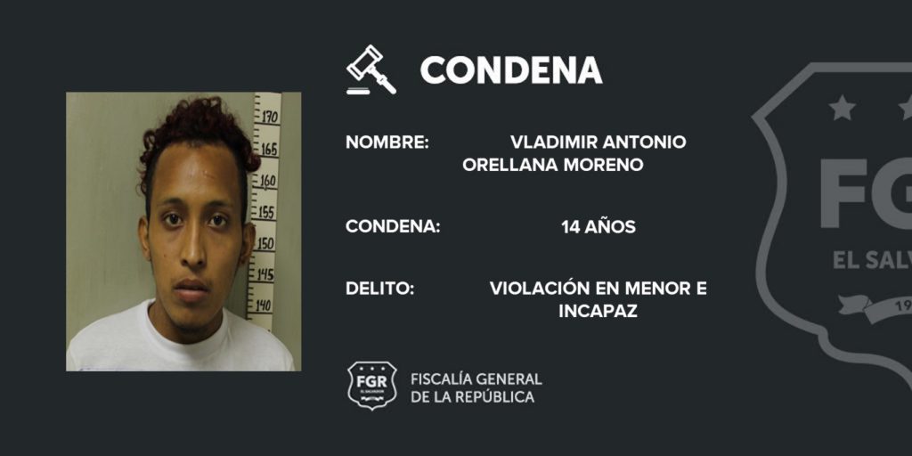 La Unidad de Atención Especializada para la Mujer, Niñez y Adolescencia (UAEMNA) de Oficina Santa Tecla, con una investigación bien sustentada, hizo posible que a Vladimir Antonio Orellana Moreno, de 21 años de edad, se le condenara a 14 años de prisión por violación a una menor de edad.