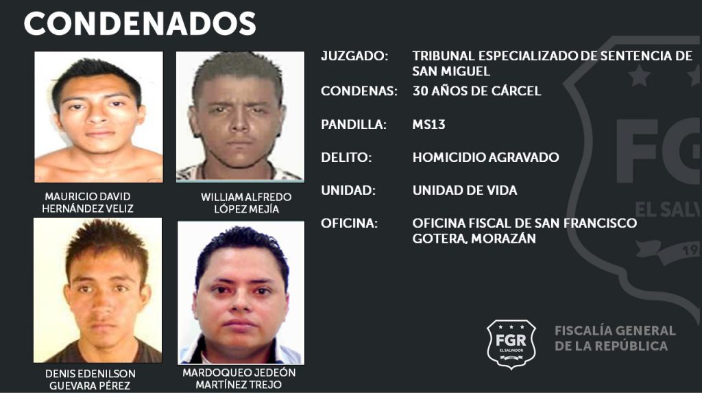 San Francisco Gotera, Morazán. Fiscales de la Unidad de Vida de la oficina de San Francisco Gotera, Morazán, lograron que un grupo de 14 miembros de la MS13 recibieran penas de prisión de entre los 30 años por Homicidio Agravado, y 10 y 12 años por su pertenencia al grupo terrorista.