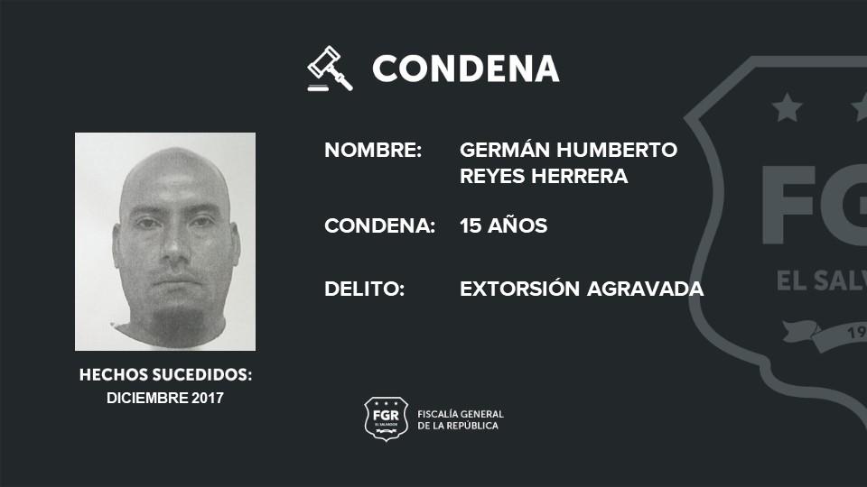 Ahuachapán. La Fiscalía General de la República (FGR) logró 15 años de prisión para Germán Humberto Reyes Herrera, quien fue declarado culpable de haber cometido el delito de extorsión agravada.