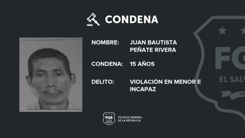 Ahuachapán. Con pruebas documentales, periciales y declaración de la víctima, la Fiscalía General de la República demostró que Juan Bautista Peñate Rivera cometió el delito de Violación en Menor e Incapaz en perjuicio de una menor de edad. El imputado fue condenado a 15 años de cárcel.