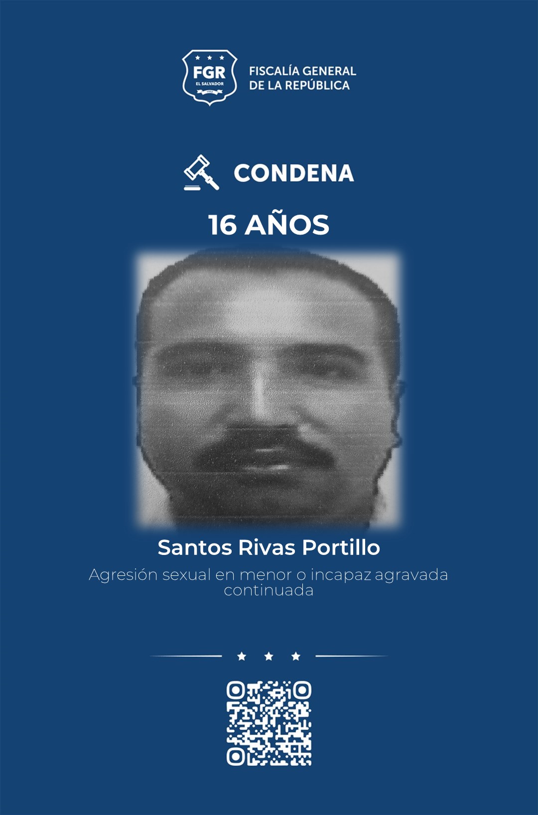 La FGR presentó abundante prueba de cargo durante la vista pública. Además de ser condenado por el delito de agresión sexual en menor o incapaz agravada continuada Rivas Portillo fue condenado por responsabilidad civil por $800.00.