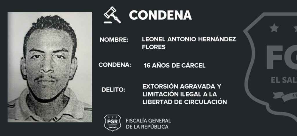 Leonel Antonio Hernández Flores deberá permanecer en prisión los próximos 16 años, luego que la Fiscalía comprobara su culpabilidad en extorsionar y amenazar víctimas para que abandonaran sus viviendas y así apropiárselas en el municipio de Apopa.