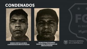 Los imputados condenados son: Irving Stanley Ramírez Quintanilla, alias “El Enano” y Dennis José Villalobos Flores, alias “Panza”. Ambos sujetos en compañía de dos más que actualmente huyen de la justicia interceptaron a la víctima en un camino rural de la Finca San Francisco El Potreron del Cantón El Rosario del municipio de Comasagua.