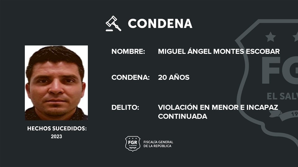 Chalatenango La Fiscalía General de la República (FGR) hizo justicia para una menor de edad, quien fue fue violada en varias ocasiones por Miguel Ángel Montes Escobar. Por esos hechos, el imputado fue condenado a 20 años de prisión.