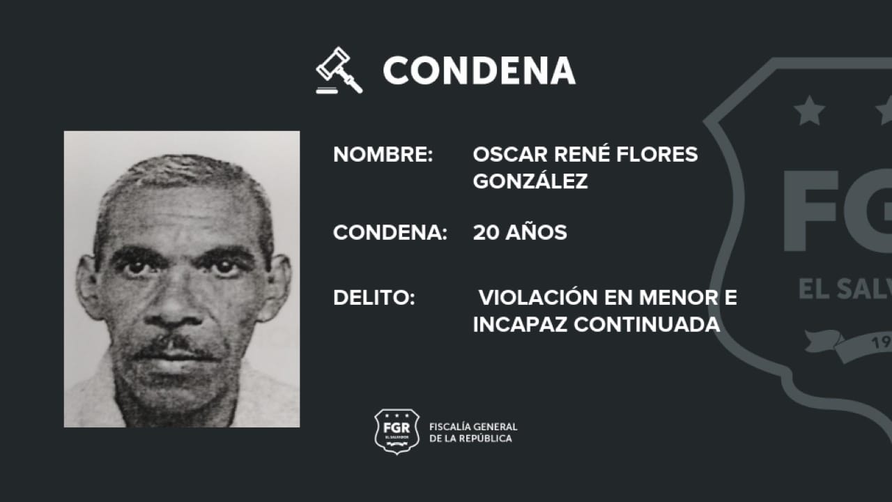 Santa Tecla, La Libertad. Oscar René Flores González fue condenado a 20 años de cárcel por haber violado a una menor de 8 años en reiteradas ocasiones en Lourdes Colón, La Libertad; las agresiones iniciaron desde el 2013 y se mantuvieron hasta el 2017.