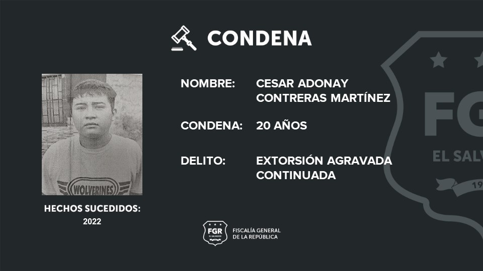 San Salvador. Cesar Adonay Contreras Martínez, perfilado como pandillero de la MS, fue condenado a 20 años de cárcel luego que la Fiscalía demostrará que cometió el delito de extorsión agravada en modalidad continuada.