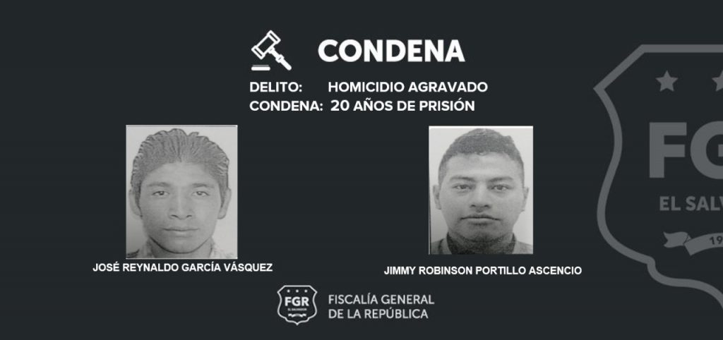 Cojutepeque, Cuscatlán. La Fiscalía continúa sumando penas ejemplares que durante años vivieron atemorizando a la población salvadoreña, ese es el caso de Jimmy Robinson Portillo Ascencio y José Reynaldo García Vásquez, miembros de la pandilla Barrio 18, a quienes se les impuso una condena de 20 años de prisión por el delito de Homicidio Agravado.