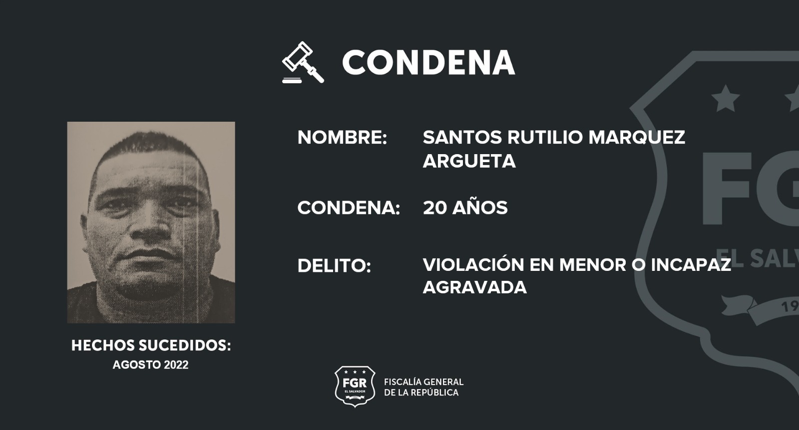Cojutepeque, Cuscatlán. Luego de dos días de juicio en los cuales los fiscales presentaron abundante prueba contra Santos Rutilio Márquez Argueta, fue posible que se le condenara a 20 años de prisión por el delito de violación en menor o incapaz agravada.