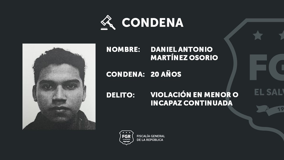 Ahuachapán. Una vez más, la Fiscalía logra justicia para las personas que han sido víctimas de delitos sexuales; esta vez, Daniel Martínez Osorio fue condenado a 20 años de cárcel por haber violado a una menor de edad, en Ahuachapán.