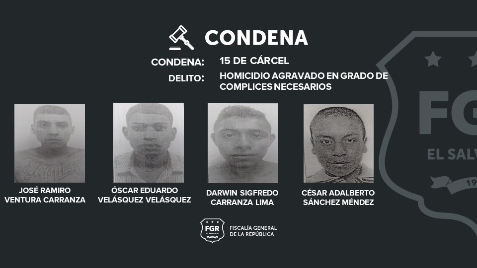 15 años de cárcel se les impusieron a José Ramiro Ventura Carranza, Óscar Eduardo Velásquez Velásquez, Darwin Sigfredo Carranza Lima, César Adalberto Sánchez Méndez, por ser cómplices en el delito de Homicidio Agravado.