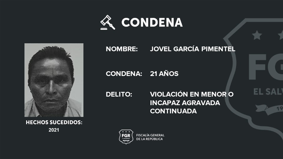Ahuachapán. Jovel García Pimentel fue sentenciado a 21 años de prisión luego que la Fiscalía comprobó en juicio que él habría violado a una menor de edad en en Guaymango, Ahuachapán en el año 2021.