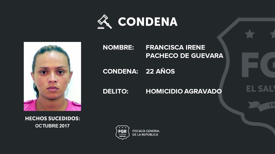 Santa Ana. Francisca Irene Pacheco de Guevara, fue condenada a 22 años de cárcel por el Tribunal Segundo de Sentencia de Santa Ana, tras ser vencida en juicio por las pruebas presentadas por la Fiscalía.