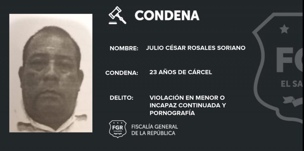 La Fiscalía General de la República logró que Julio César Rosales Soriano sea declarado culpable por haber violado a una menor de edad; por lo que recibió una condena de 23 años de prisión.