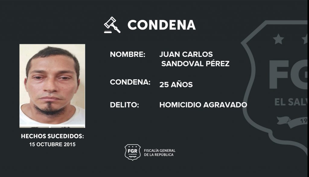 San Salvador. La Fiscalía General de la República logró que, Juan Carlos Sandoval Pérez -corredor de la Clica Tonaca Criminal Locos Salvatruchos- sea sentenciado a cumplir pena de 25 años de prisión al quedar demostrado que consumó un crimen en el municipio de Tonacatepeque, al norte de la capital.
