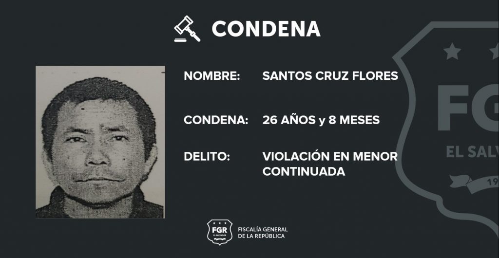 San Vicente. La Fiscalía General de la República logró que se condenara a Santos Cruz Flores a 26 años y 8 meses de prisión por el delito de Violación Agravada en Menor, modalidad Continuada. Los hechos sucedieron durante los años 2006 al 2012, en el municipio de Rosario, departamento de La Paz.