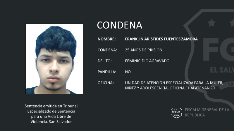 Chalatenango: Franklin Arístides Fuentes Zamora fue declarado culpable del Feminicidio Agravado en perjuicio de su compañera de vida. Hecho ocurrido en un entorno de violencia el 26 de octubre de 2018, en Concepción Quezaltepeque, Chalatenango.