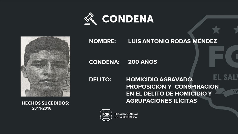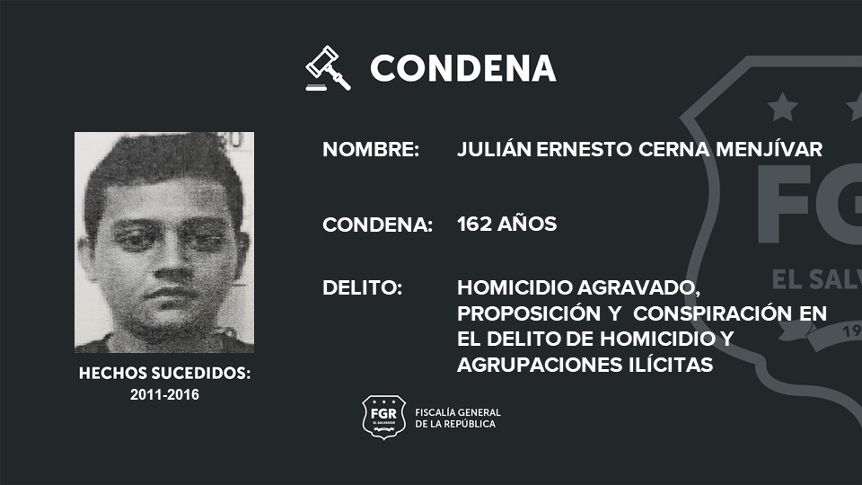 Por 4 homicidios agravados, por agrupaciones ilícitas y planificar varios homicidios, Julián Ernesto Cerna Menjívar, conocido por Julián Ernesto Menjívar Cerna o Marvin Ernesto Mancia Vásquez, alias “Splinter”, fue condenado a 162 años de prisión.