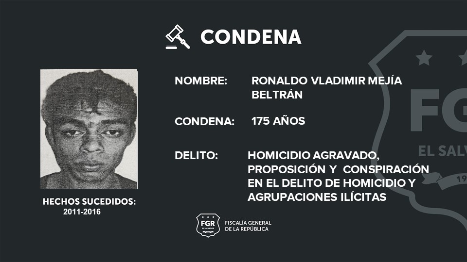 Asimismo, Ronaldo Vladimir Mejía Beltrán, alias “Ronaldo”, fue condenado a 175 años de cárcel por 5 homicidios agravados, 3 privaciones de libertad y por agrupaciones ilícitas.