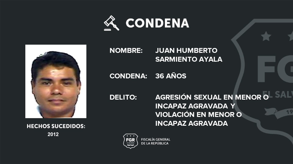 Ahuachapán. La Fiscalía General de la República (FGR) logró una condena de 36 años de cárcel para Juan Humberto Sarmiento Ayala, a quien se le procesó por el delito de violación en menor e incapaz agravada y agresión sexual en menor e incapaz agravada.