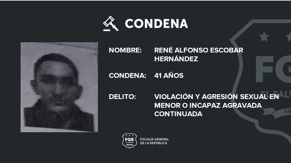 Santa Ana. La Fiscalía General de la República logró que René Alfonso Escobar Hernández sea sentenciado a 41 años de prisión, luego que en un juicio se le comprobara que había violado a una niña de cinco años en el año 2012, en Metapán, Santa Ana.