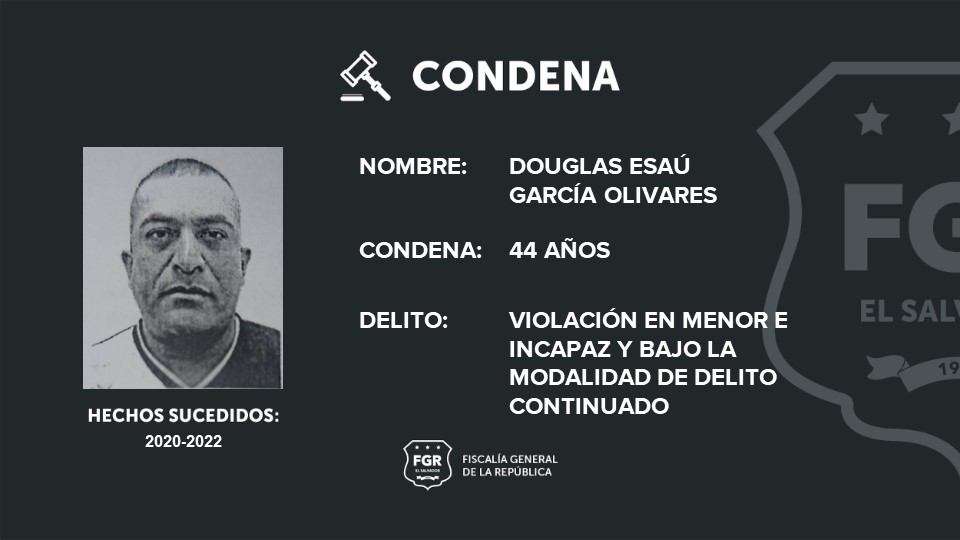 Santa Ana. La Fiscalía General de la República (FGR) logró hacer justicia a favor de una niña y que Douglas Esaú García Olivares sea condenado a 44 años de prisión. Estos hechos ocurrieron entre el 2020 y 2022 en el distrito de Chalchuapa, Santa Ana.