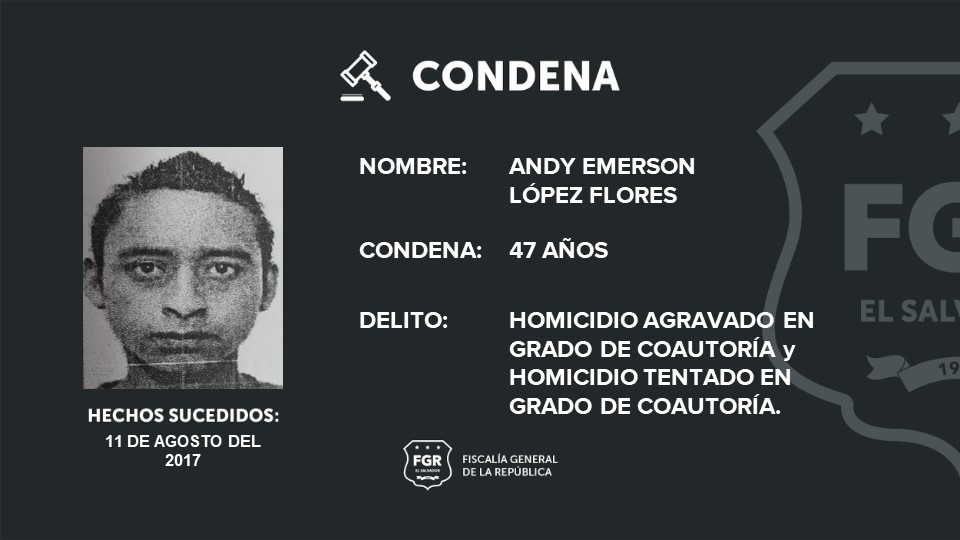 Santa Ana. La Fiscalía obtuvo una condena de 47 años de prisión para el terrorista de la MS, Andy Emerson López Flores, a quien se le atribuyeron los delitos de homicidio agravado en grado de coautoría contra dos personas y un homicidio tentado en grado de coautoría.