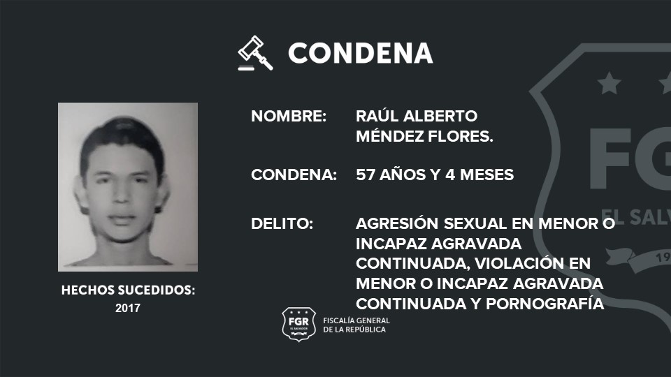 Santa Ana. La Fiscalía General de la República consiguió una condena ejemplar para Raúl Alberto Méndez Flores, a quien en un juicio se le sentenció a 57 años de prisión por haber mostrado material pornográfico a una menor de edad, a quien además violó y agredió sexualmente.