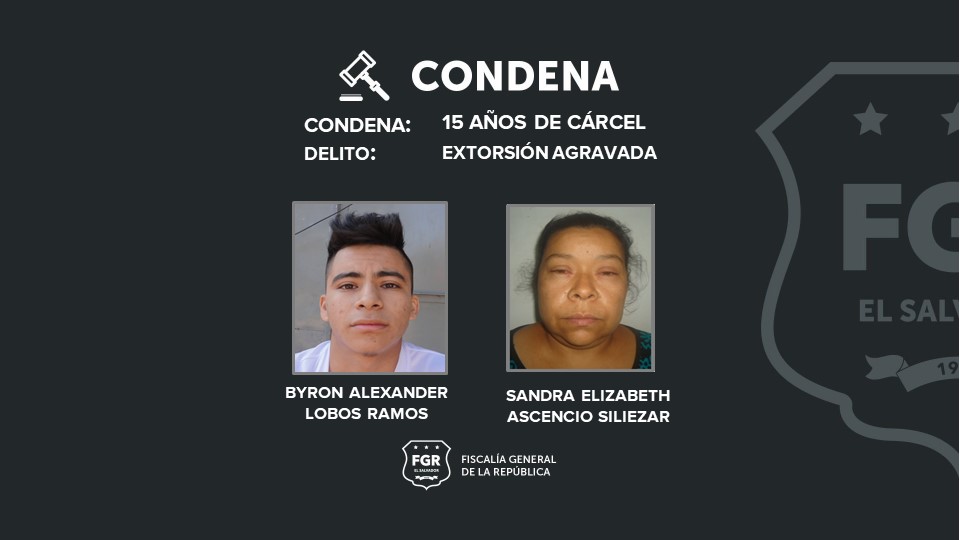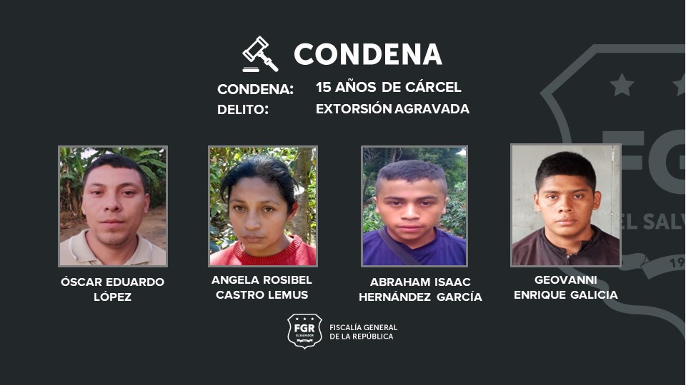 Ahuachapán. Óscar Eduardo López, Ángela Rosibel Castro Lemus, Abraham Isaac Hernández García, Geovanni Enrique Galicia Peñate, Byron Alexander Lobos Ramos y Sandra Elizabeth Ascencio Siliezar fueron condenados a 15 años de prisión por haber cometido el delito de extorsión agravada.