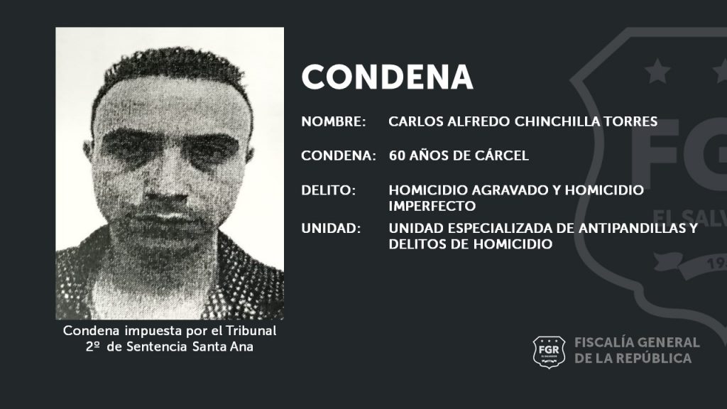 Santa Ana. La Fiscalía General de la República dio a conocer el fallo condenatorio emitido en Santa Ana, en contra de un miembro de estructura, quien fue declarado culpable de causarle la muerte a un agente de la Policía Nacional Civil y tratar de causarle la muerte a un segundo policía. Por ambos hechos pagará con 60 años en prisión.
