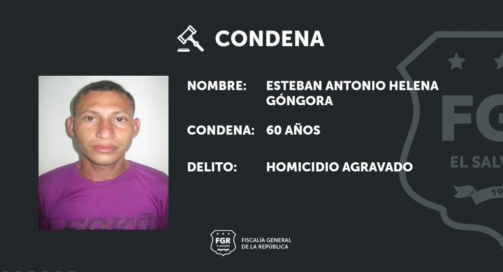 San Vicente. Un peligroso miembro de la Mara Salvatrucha, MS-13, fue condenado a 60 años de prisión, por el delito de Homicidio Agravado, gracias a las investigaciones lideradas por la Fiscalía. El terrorista fue identificado como Esteban Antonio Helena Góngora, miembro de la clica Directos Locos Salvatruchos de la MS-13.