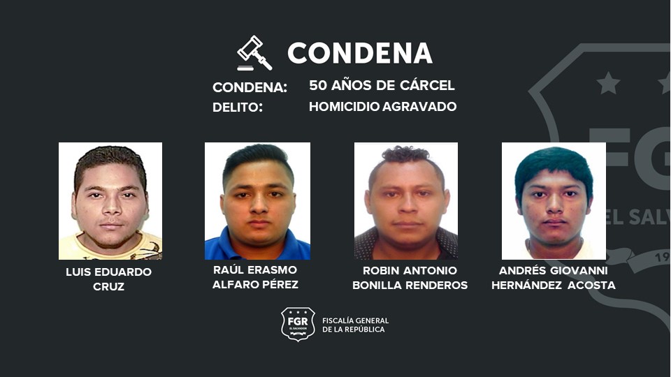 Los pandilleros condenados a 50 años son: Luis Eduardo Cruz, Raúl Erasmo Alfaro Pérez, Robin Antonio Bonilla Renderos, César Mauricio Alvarado Marroquín (ausente), Juan José Martínez Hernández (ausente) y Andrés Giovanni Hernández Acosta.