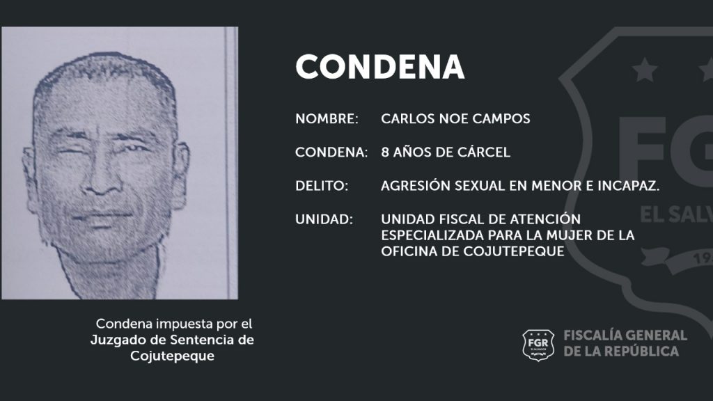 La fiscal del caso de la Unidad de Atención Especializada para la Mujer de la oficina de Cojutepeque informó que el Tribunal de Sentencia de esa ciudad valoró las pruebas presentadas y estableció que con las mismas se podía establecer la culpabilidad de Carlos Noé Campos, de 61 años, en el delito de Agresión Sexual en Menor e Incapaz.