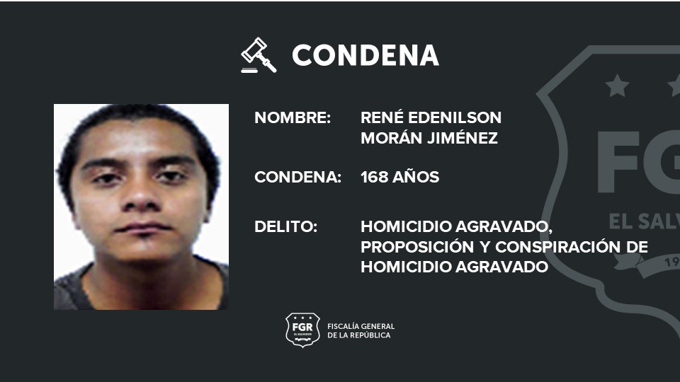 Asimismo, René Edenilson Morán Jiménez fue sentenciado a 168 años de cárcel por 6 Homicidios Agravados, 25 años por cada uno, y por 3 casos de planificación de homicidios, 6 años de prisión por cada uno.
