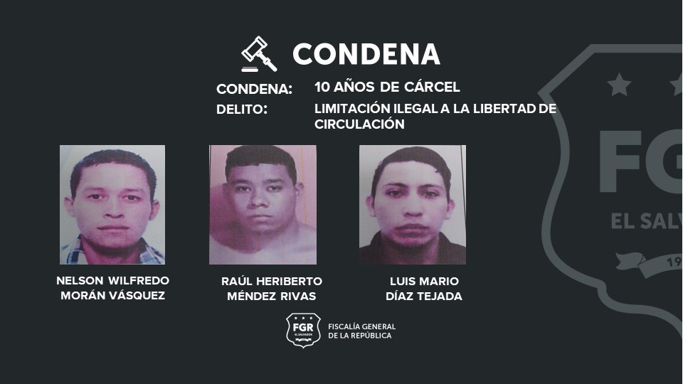 Santa Ana. Luis Mario Díaz Tejada, Raúl Heriberto Méndez Rivas y Nelson Wilfredo Morán fueron condenados a 10 años de cárcel por haber cometido el delito de limitación ilegal a la libertad de circulación.
