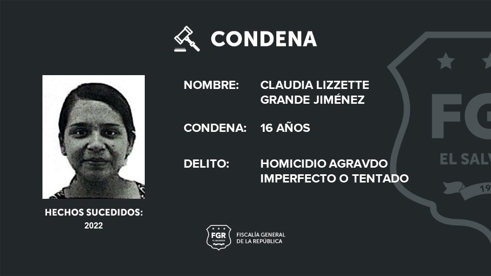 Santa Tecla, La Libertad. Claudia Lizzette Grande Jiménez fue condenada a 16 años de prisión por haber intentado asesinar a su esposo, dos días después de haberse casado con él. El delito se cometió el 18 de diciembre del año 2022.