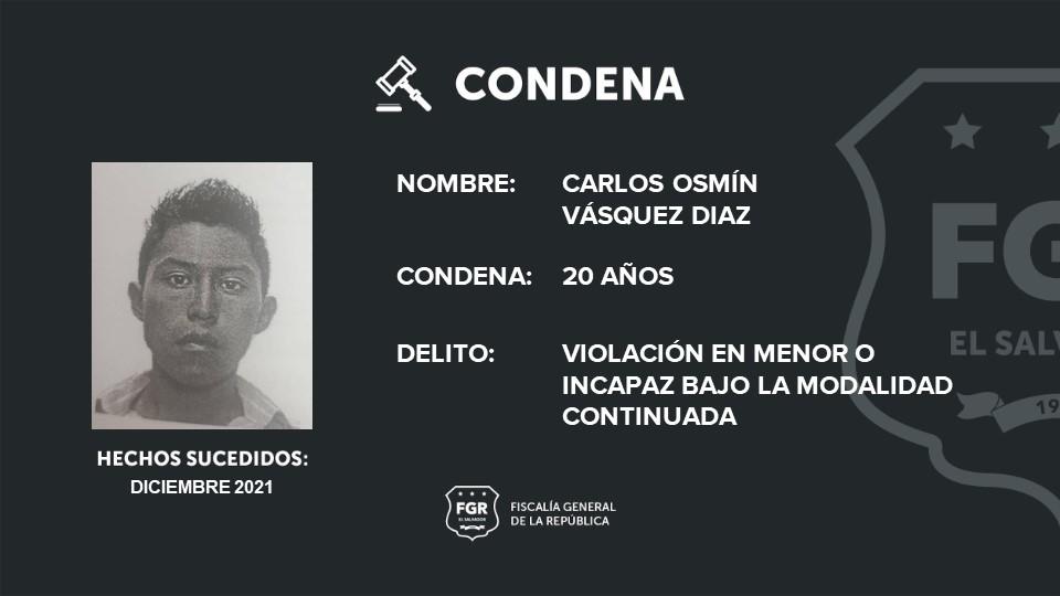 Santa Ana. Carlos Osmín Vásquez Díaz fue condenado a 20 años de cárcel luego que la Fiscalía presentara abundantes pruebas que lo incriminaban como el responsable de una violación en contra de una menor de edad.