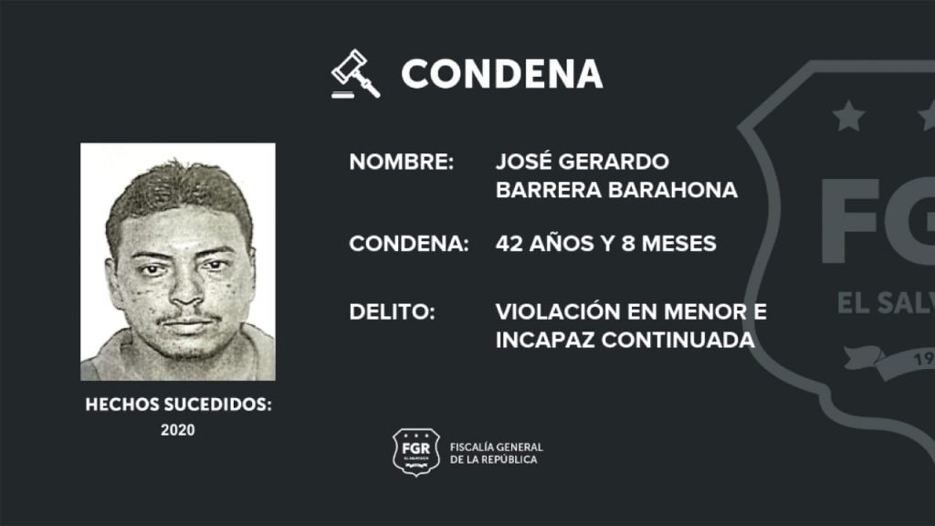 Quezalatepeque, La Libertad. La Fiscalía obtuvo un resultado condenatorio de 42 años y 8 meses para José Gerardo Barrera Barahona, quien resultó culpable de haber violado a dos menores de edad.