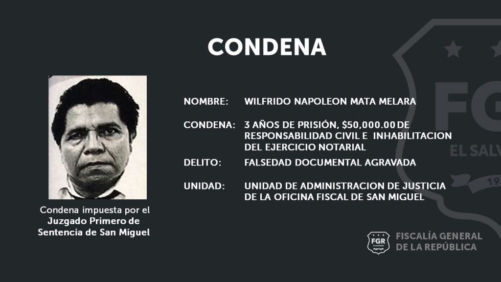 San Miguel. Fiscales de la Unidad de Administración de Justicia de la oficina de San Miguel demostraron que el Abogado y Notario, Wilfrido Napoleón Mata Melara dio fe de la legalidad de dos compraventas de inmuebles en el municipio de Quelepa, que eran falsas.
