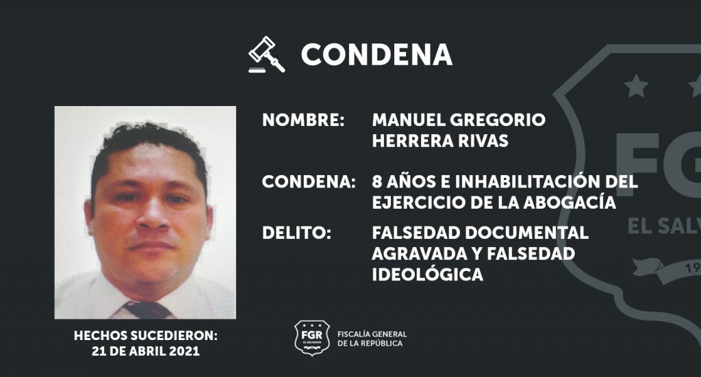 Cojutepeque, Cuscatlán. Luego de una extensa investigación liderada por los fiscales, se ha logrado condenar a un abogado y notario a 8 años de prisión e inhabilitación del ejercicio de la abogacía, por el mismo período de tiempo.