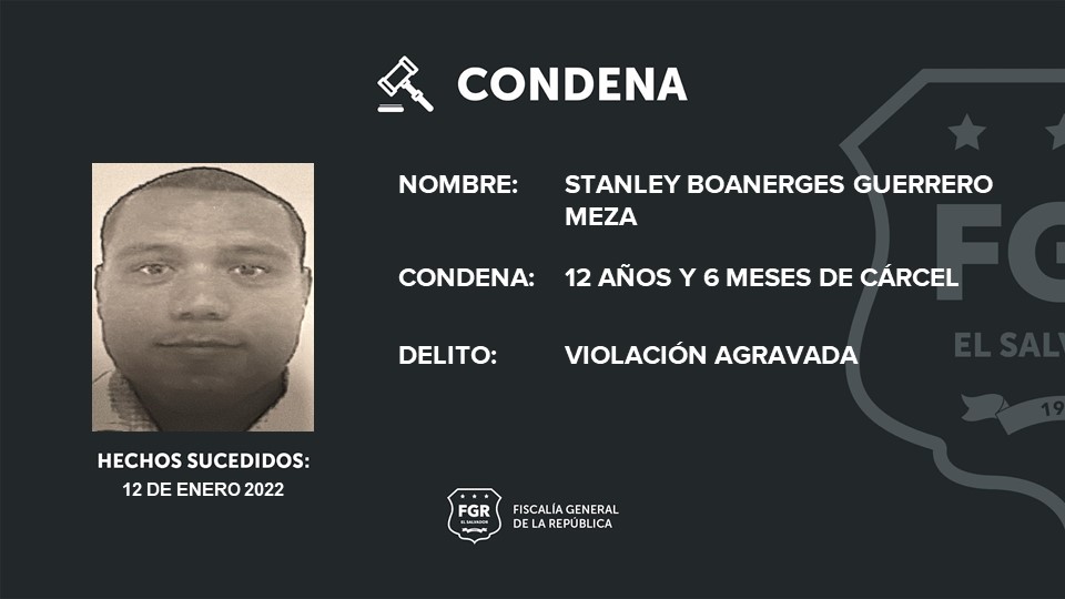Santa Tecla, La Libertad Sur. La Fiscalía General de la República (FGR) logró 12 años y 6 meses de prisión para Stanley Boanerges Guerrero Meza, por el delito de violación agravada, en perjuicio de una adolescente. Los hechos ocurrieron en Colón, La Libertad Oeste