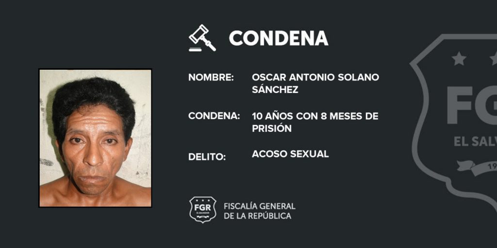Usulután. Por realizar conductas y expresar frases sexuales indeseadas en contra de dos hermanas gemelas de 14 años, Fiscales de la Unidad de Atención Especializada para la Mujer, Niñez y Adolescencia de Usulután lograron que se le impusiera una pena de prisión de 10 años con 8 meses a Oscar Antonio Solano Sánchez.