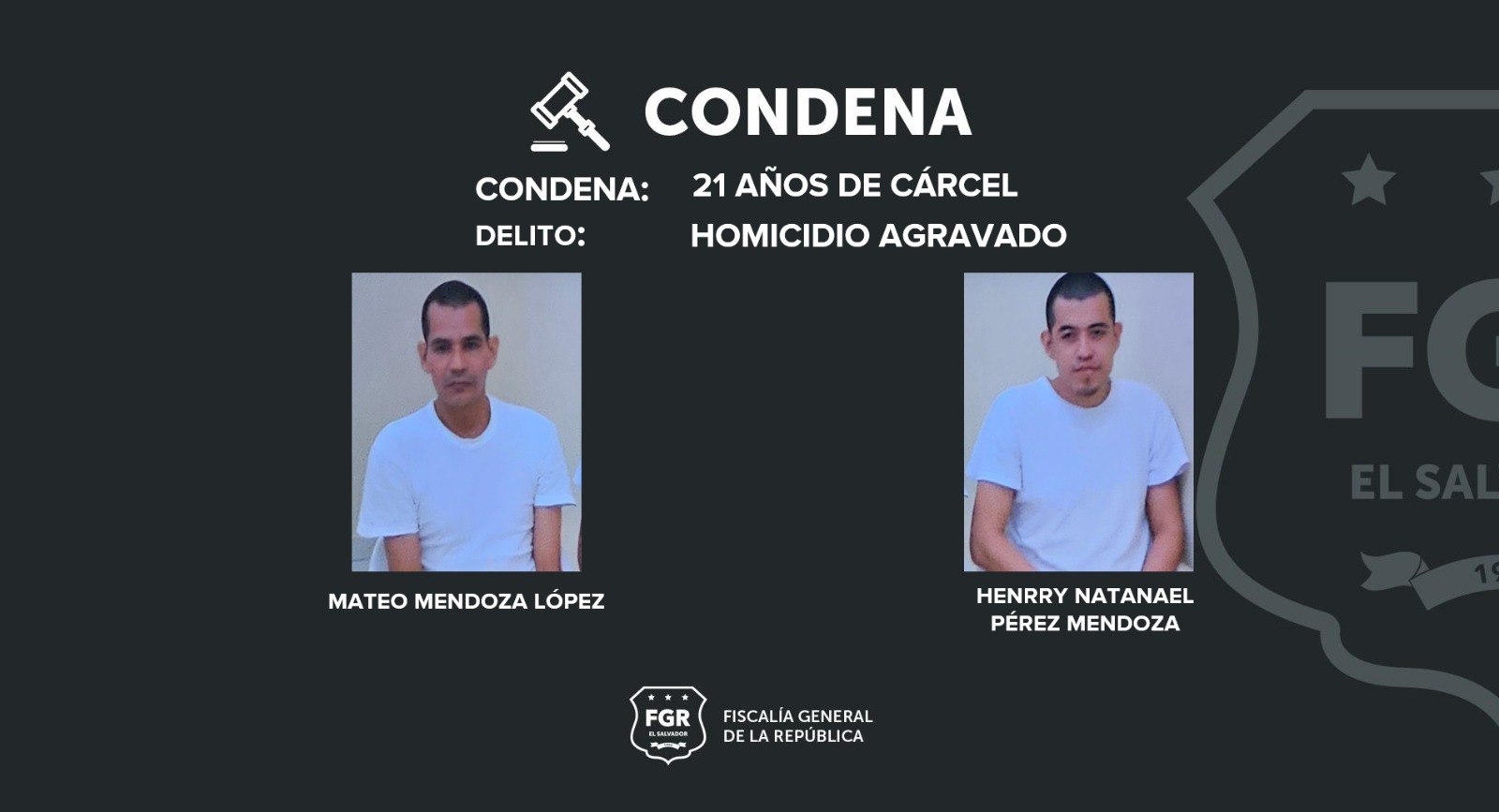 Cojutepeque, Cuscatlán. Mateo Mendoza López y Henrry Natanael Pérez Mendoza han sido condenados a 21 años de cárcel, cada uno, por el delito de homicidio agravado.