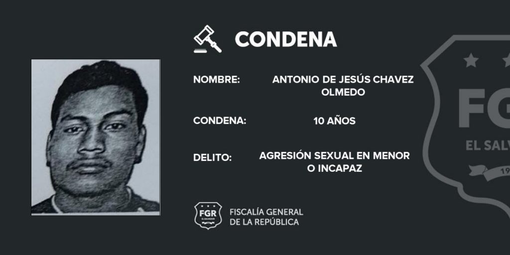 La Libertad. Con abundantes pruebas la Fiscalía General de La República (FGR) logró un castigo de 10 años de cárcel para Antonio de Jesús Chávez Olmedo, quien agredió sexualmente a una menor de siete años, quien era su sobrina.