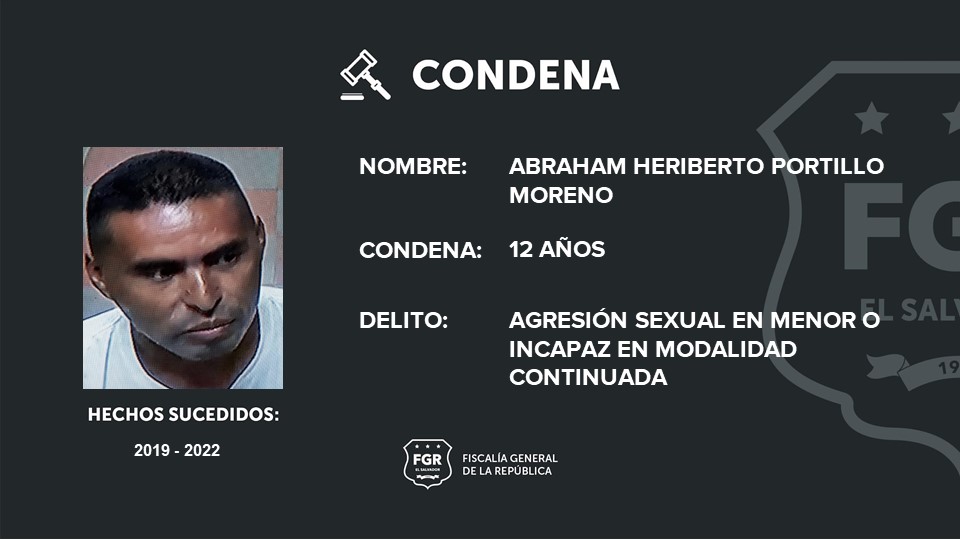 Santa Tecla, la Libertad. En su labor de justicia, la Fiscalía General de la República logró que Abraham Heriberto Portillo Moreno fuera condenado a 12 años de prisión por haber tocado indebidamente y en reiteradas ocasiones a un niño en Lourdes Colón, La Libertad. Las agresiones se produjeron desde el 2019 hasta el 2022.