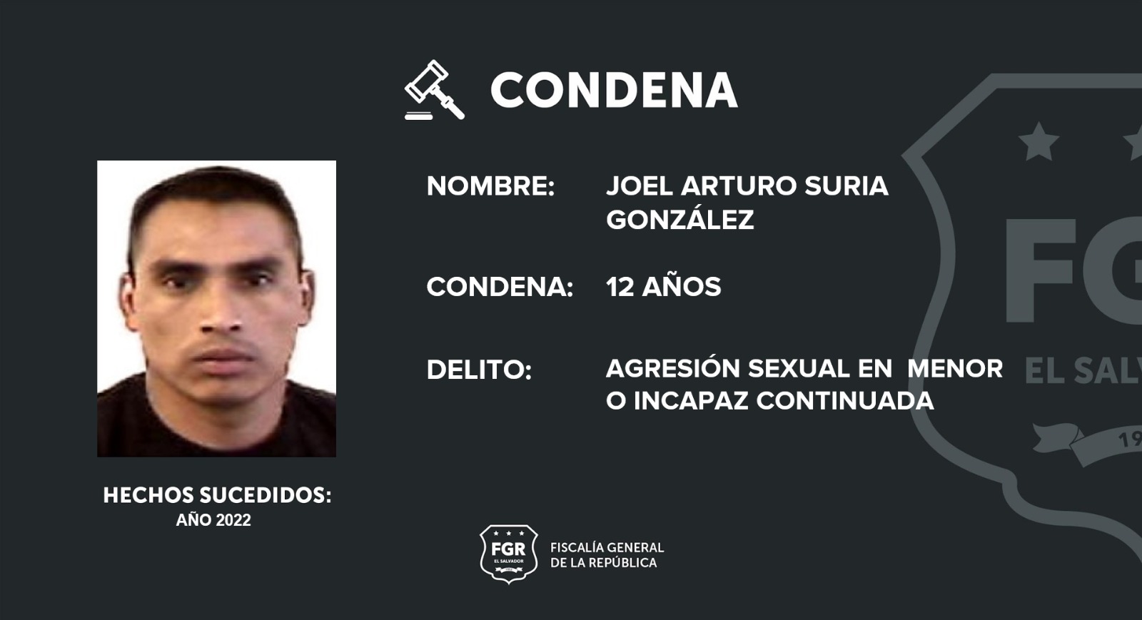 San Marcos, San Salvador. Joel Arturo Suria González ha sido condenado a 12 años de prisión por el delito de agresión sexual en menor o incapaz, modalidad continuada, gracias a la prueba presentada por las fiscales en juicio.